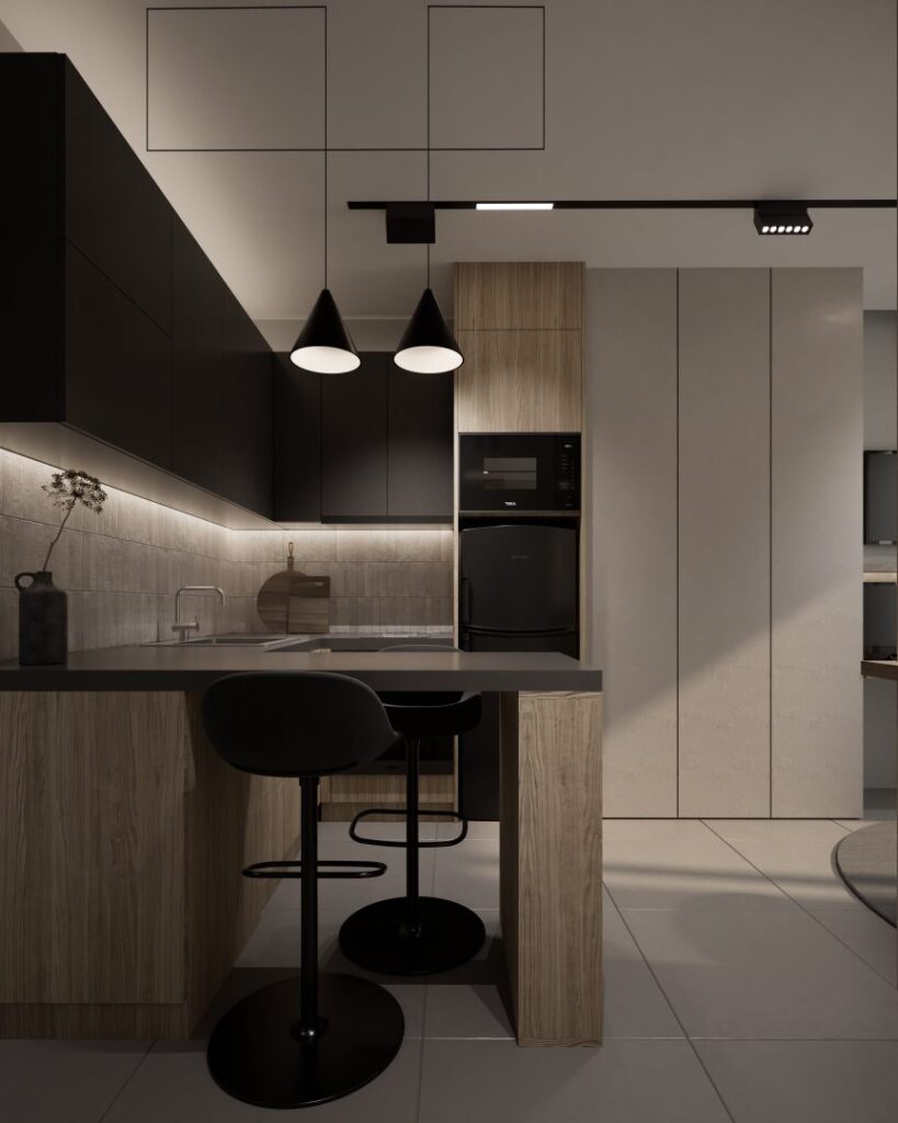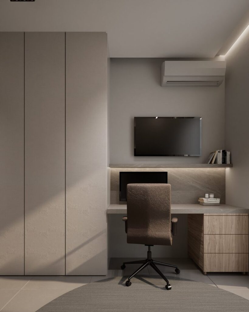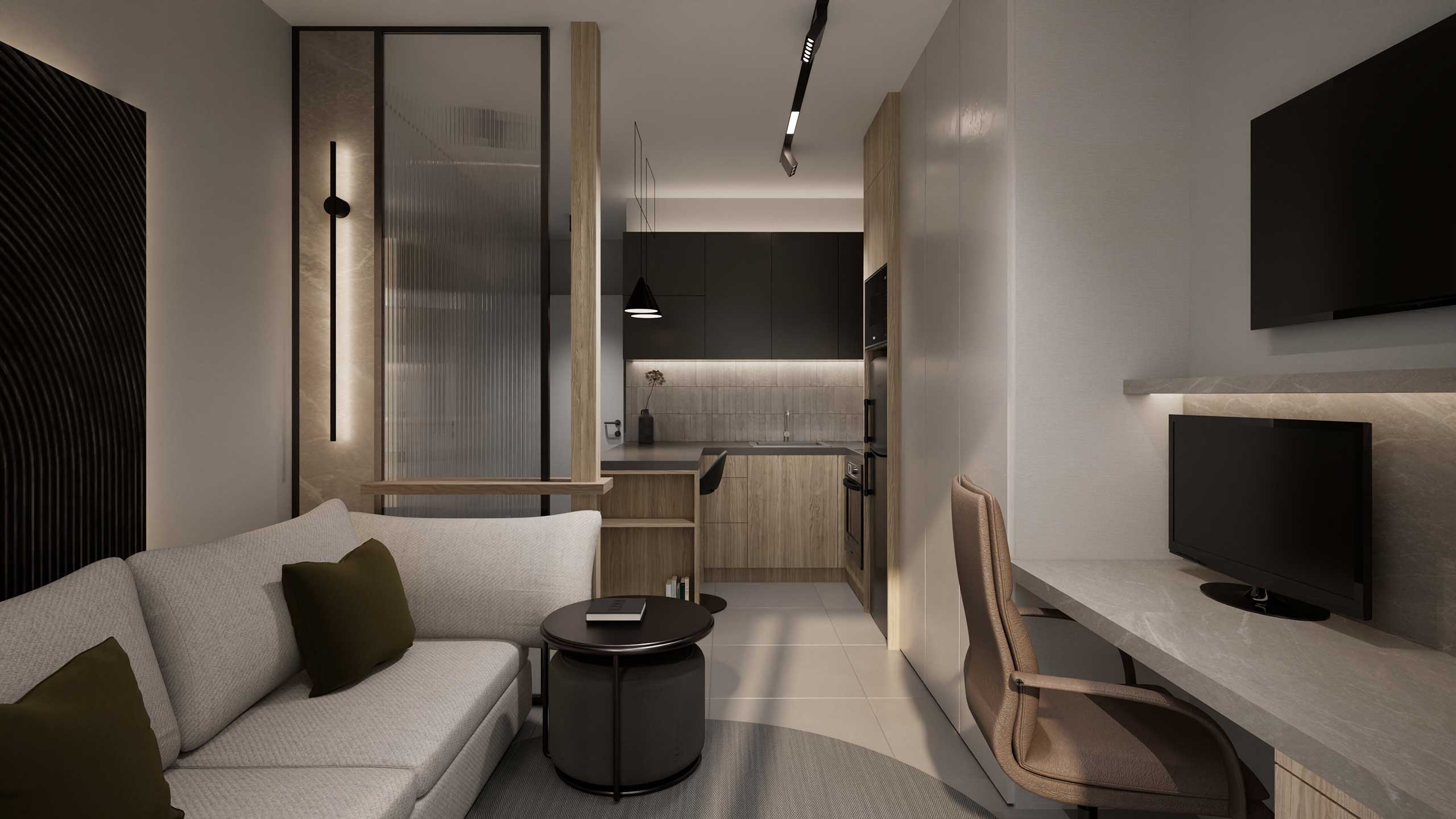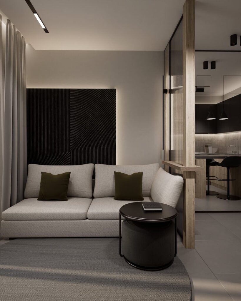 The minimal design approach in Compact Studio focuses on harmony and simplicity, where each piece of furniture and detail is purposefully placed to enhance the flow of the space. The arrangement emphasizes functionality, making this compact space feel spacious and serene.