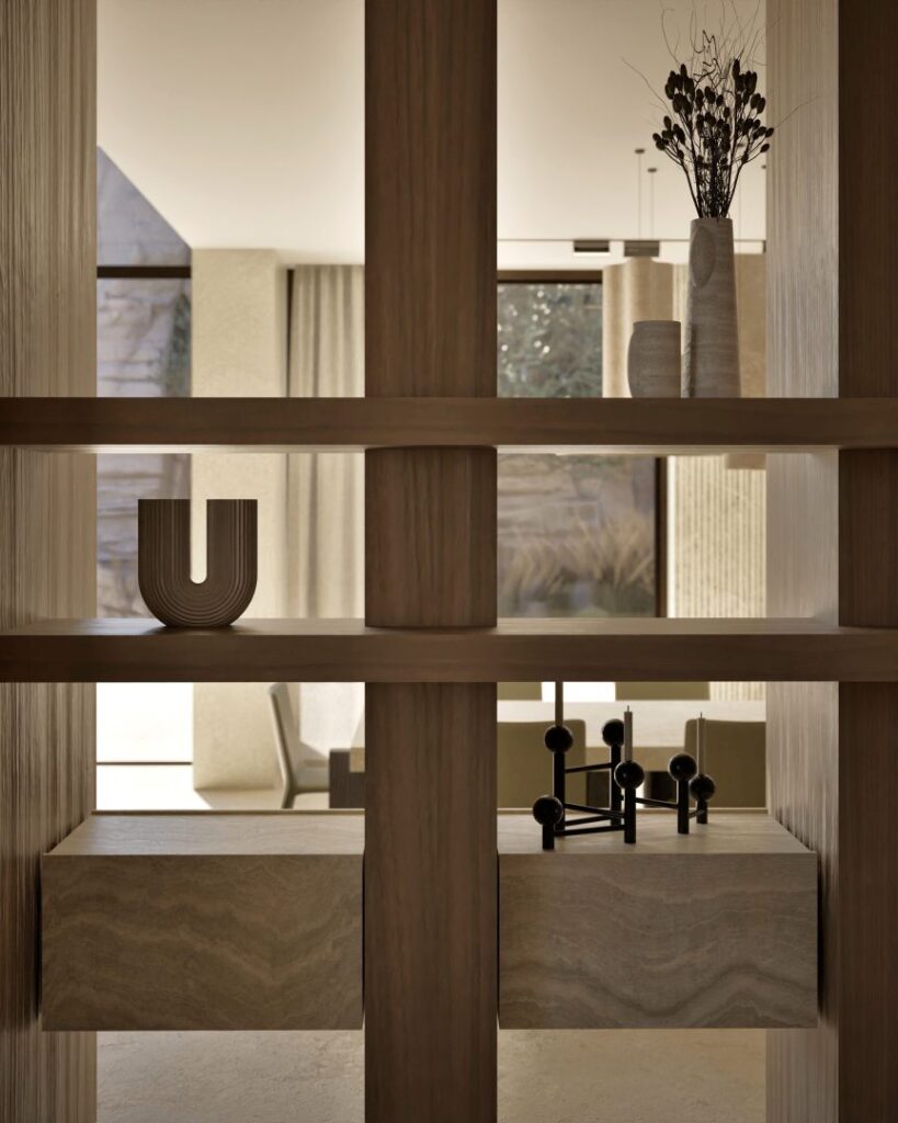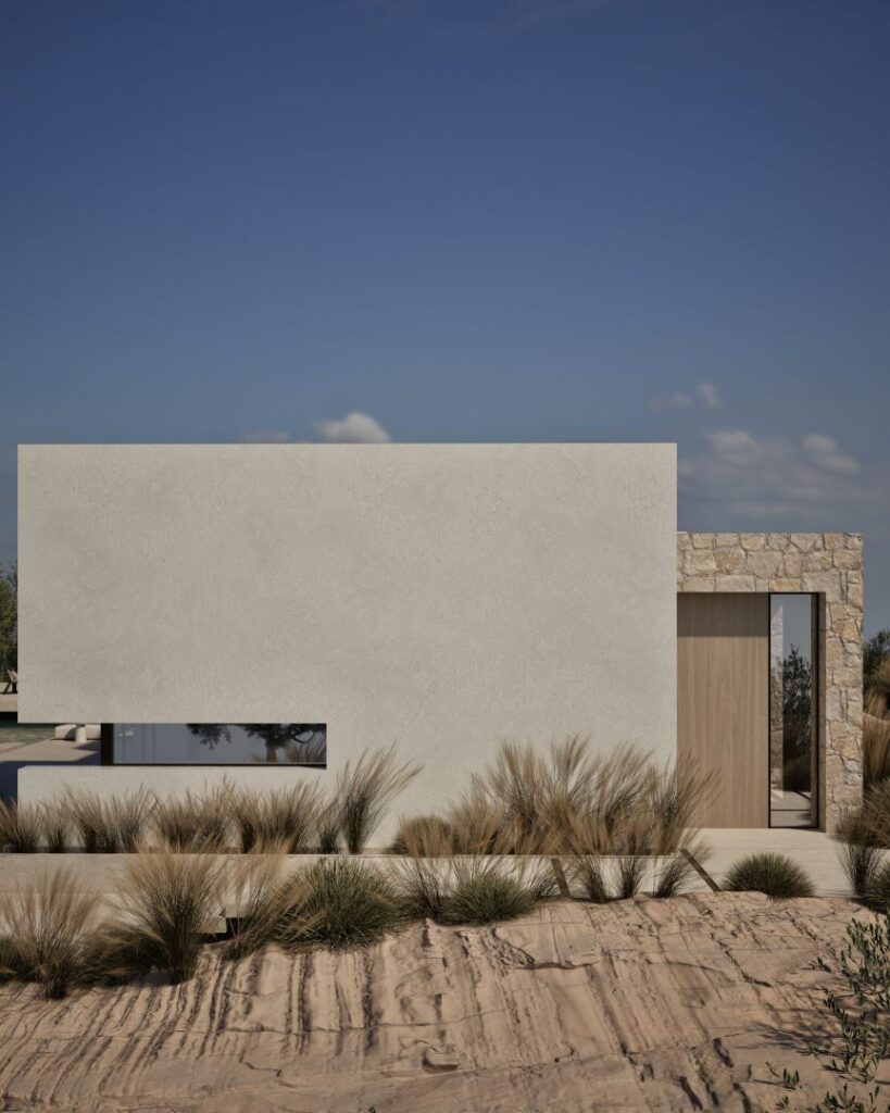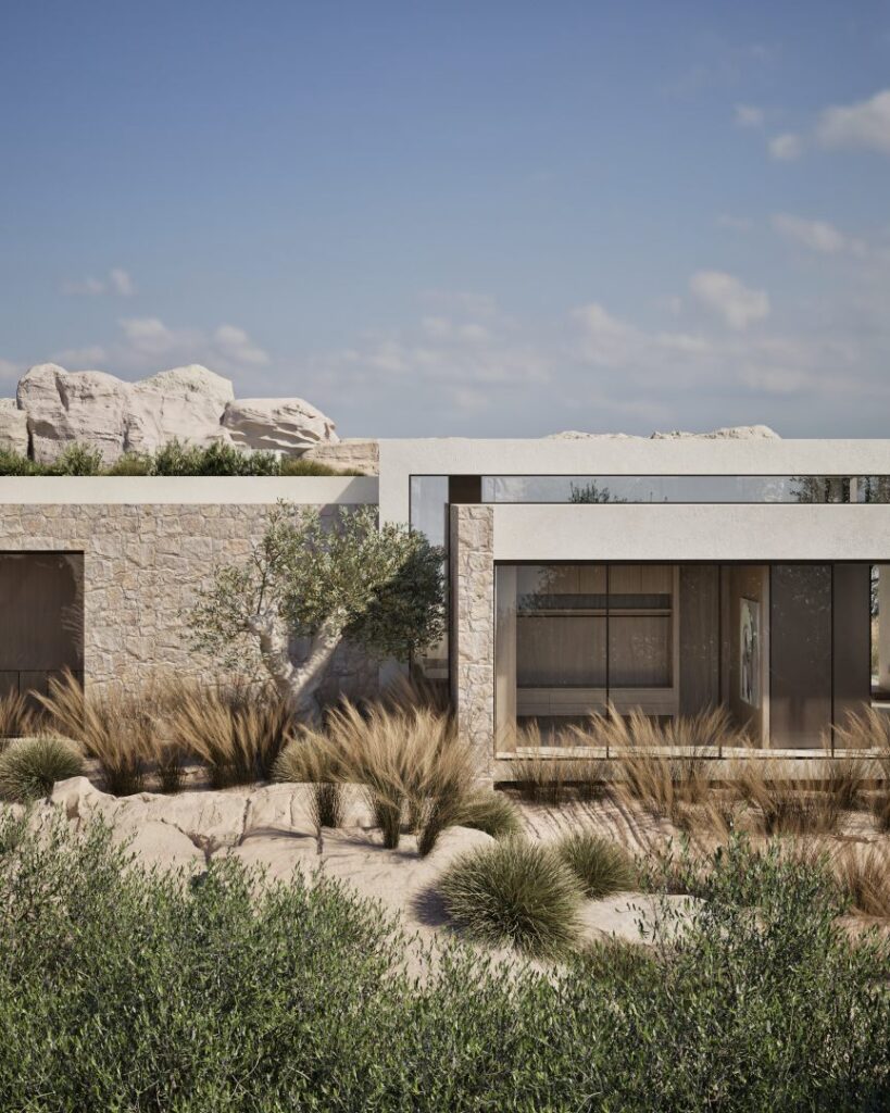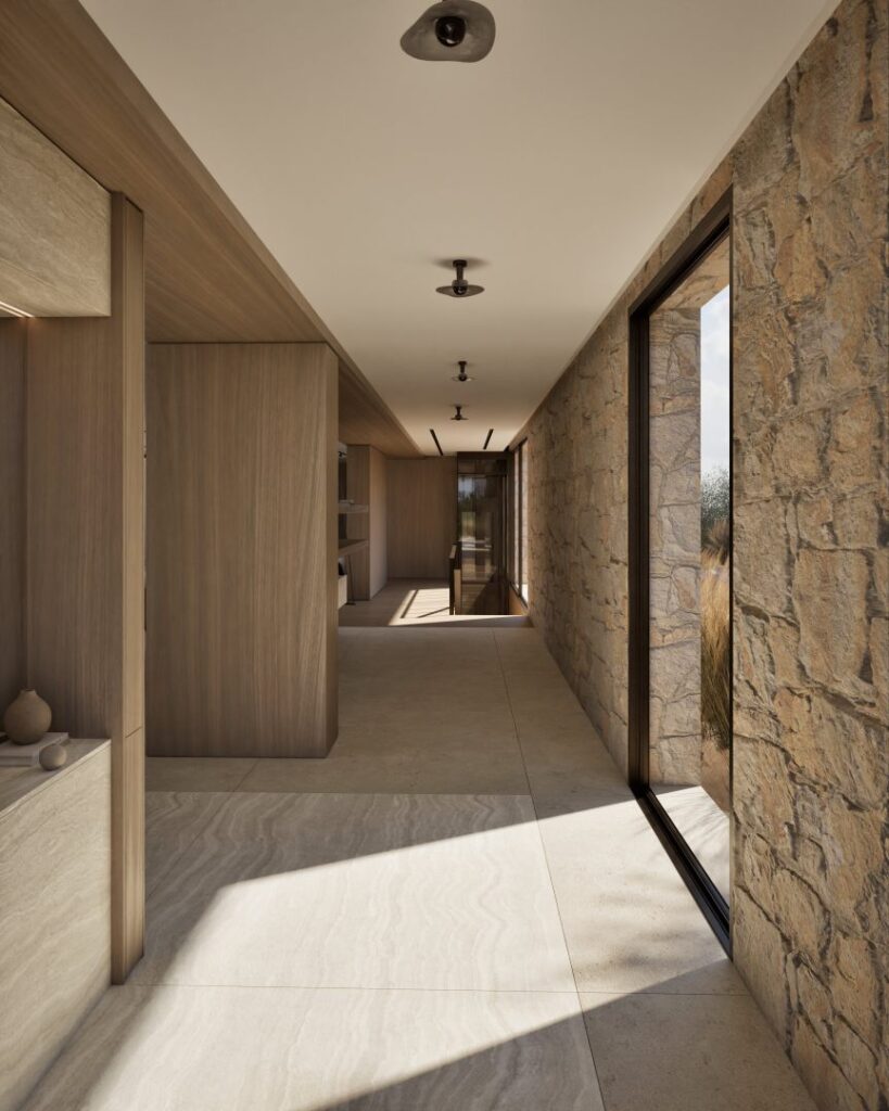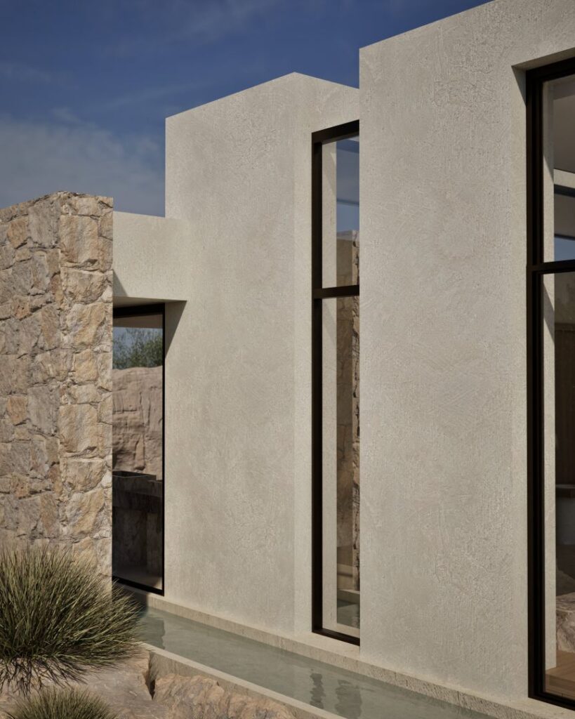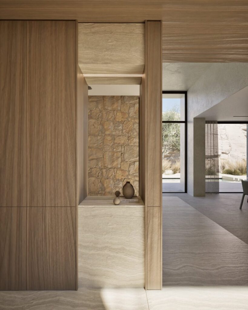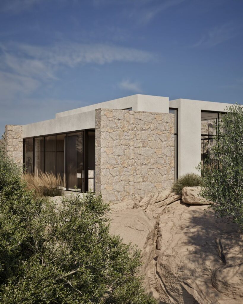 Earthstone Residence is set amidst a rugged, rocky landscape, blending effortlessly into its environment. With its strict geometric design, the residence extends horizontally, following the natural lines of the terrain and creating a seamless connection with its surroundings. The structure features large horizontal and vertical openings, allowing for expansive views and abundant natural light to flow through the space. The materials used in its construction—stone, plaster, wood, and marble—are all sourced from the surrounding environment. These elements, presented in soft, neutral tones, evoke a sense of calm and serenity.