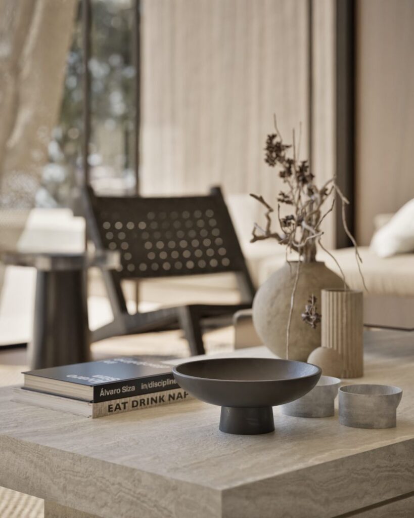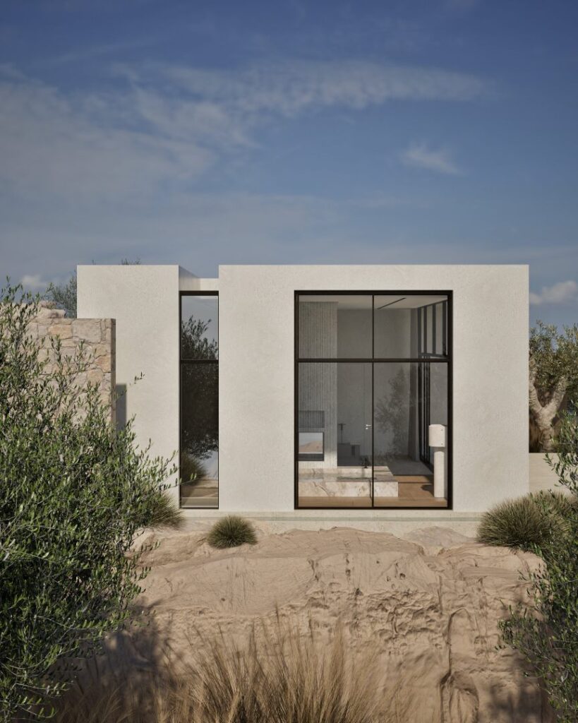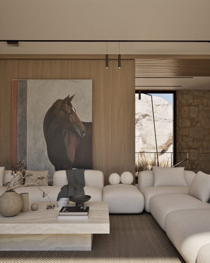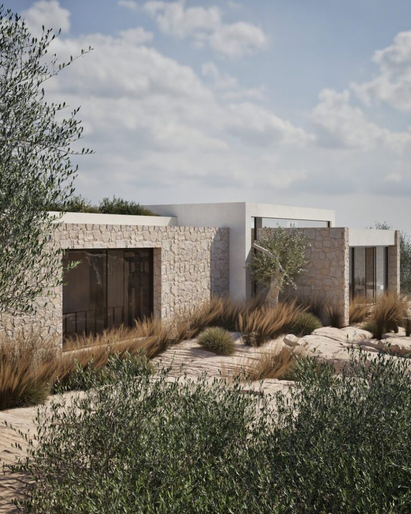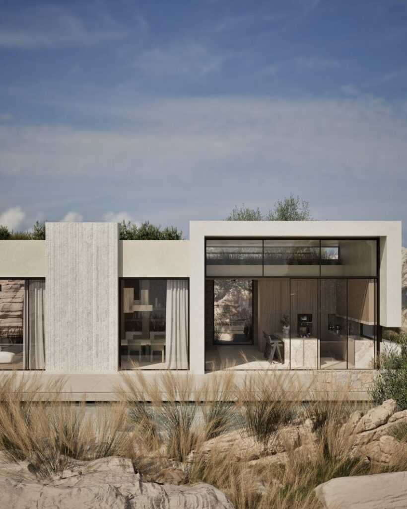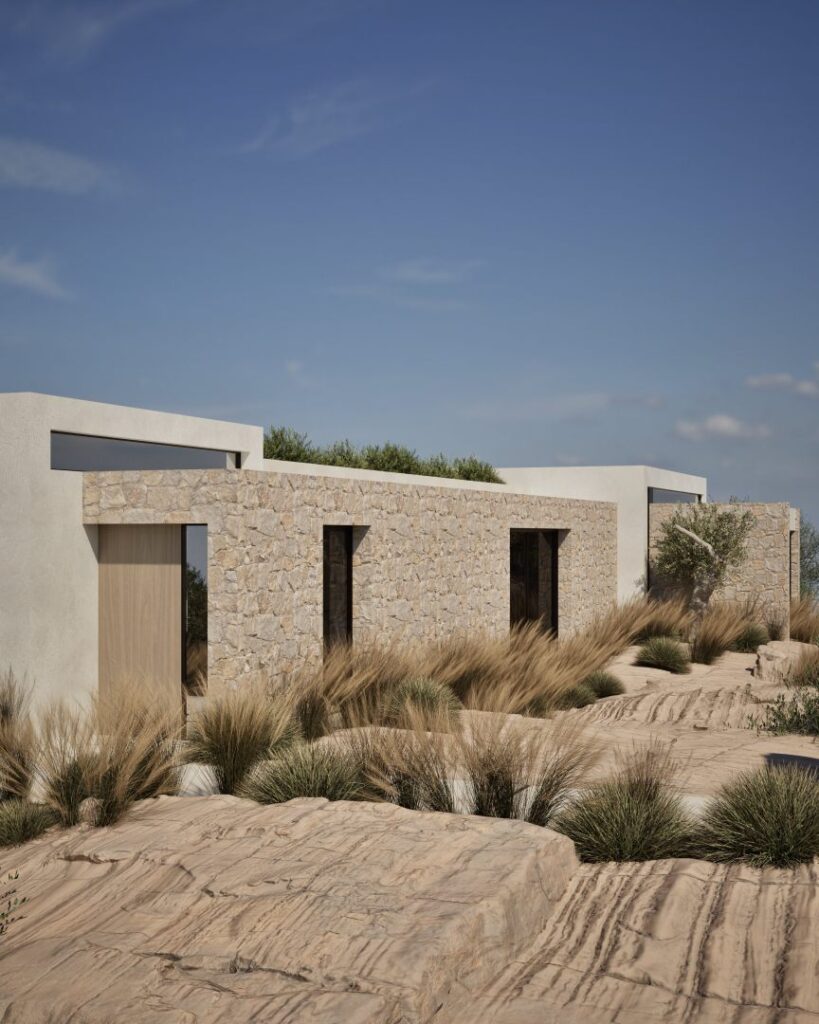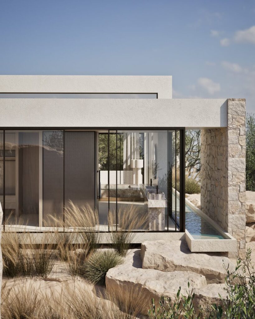 Earthstone Residence is set amidst a rugged, rocky landscape, blending effortlessly into its environment. With its strict geometric design, the residence extends horizontally, following the natural lines of the terrain and creating a seamless connection with its surroundings. The structure features large horizontal and vertical openings, allowing for expansive views and abundant natural light to flow through the space. The materials used in its construction—stone, plaster, wood, and marble—are all sourced from the surrounding environment. These elements, presented in soft, neutral tones, evoke a sense of calm and serenity.