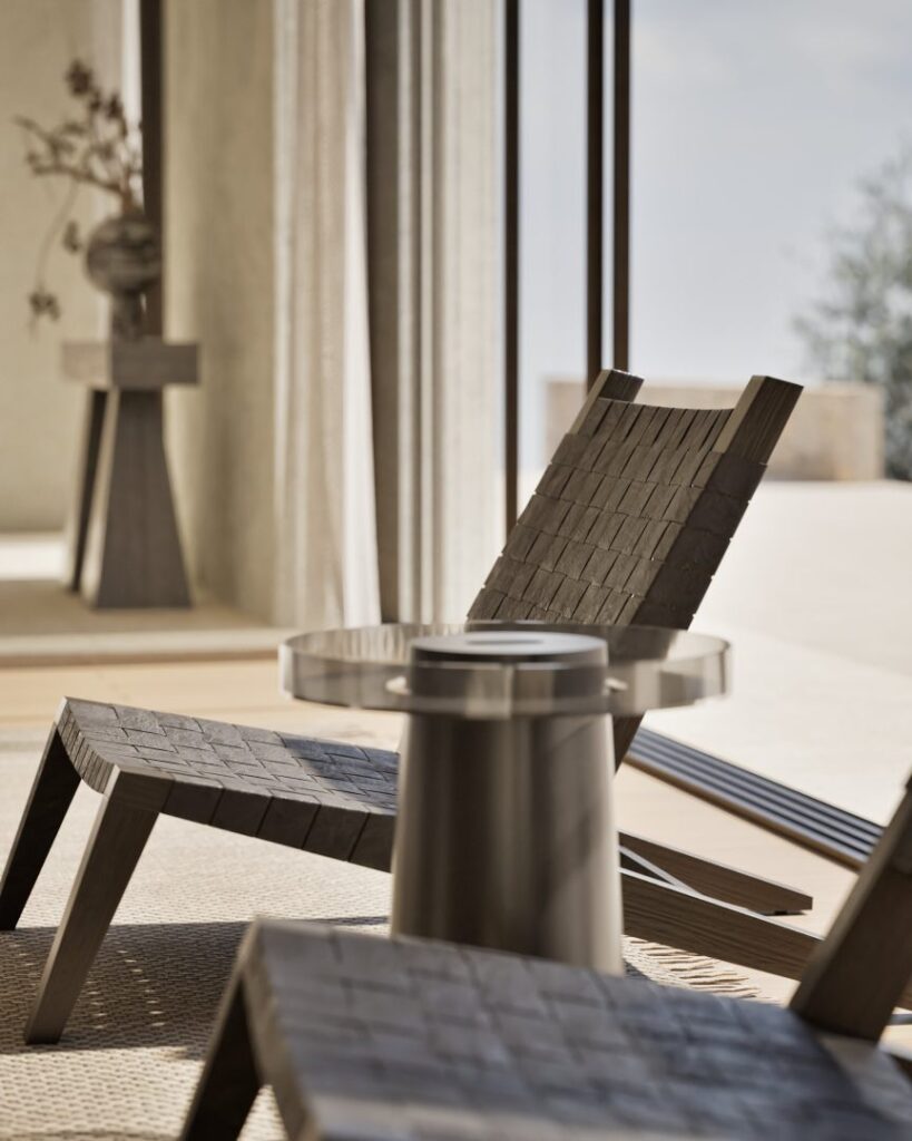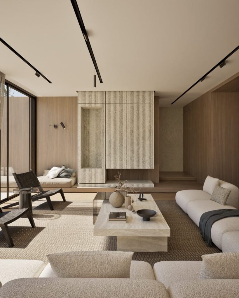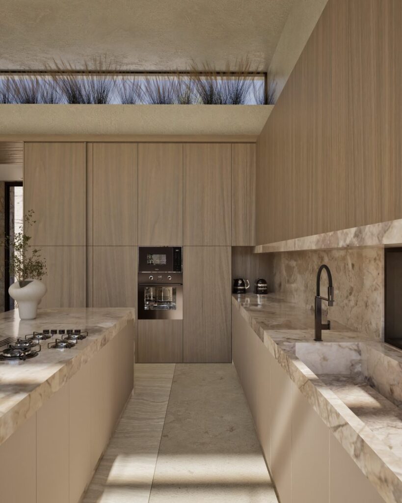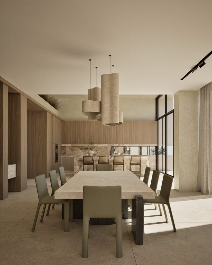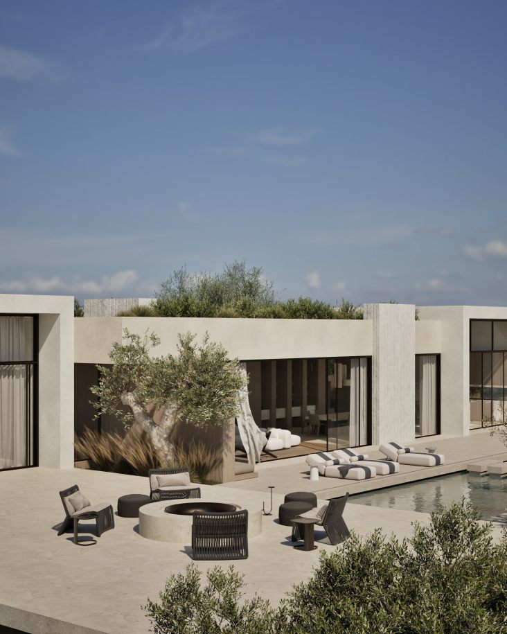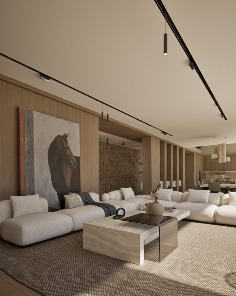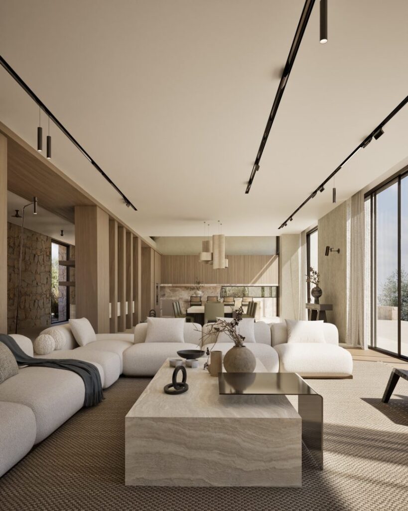 Earthstone Residence is set amidst a rugged, rocky landscape, blending effortlessly into its environment. With its strict geometric design, the residence extends horizontally, following the natural lines of the terrain and creating a seamless connection with its surroundings. The structure features large horizontal and vertical openings, allowing for expansive views and abundant natural light to flow through the space. The materials used in its construction—stone, plaster, wood, and marble—are all sourced from the surrounding environment. These elements, presented in soft, neutral tones, evoke a sense of calm and serenity.