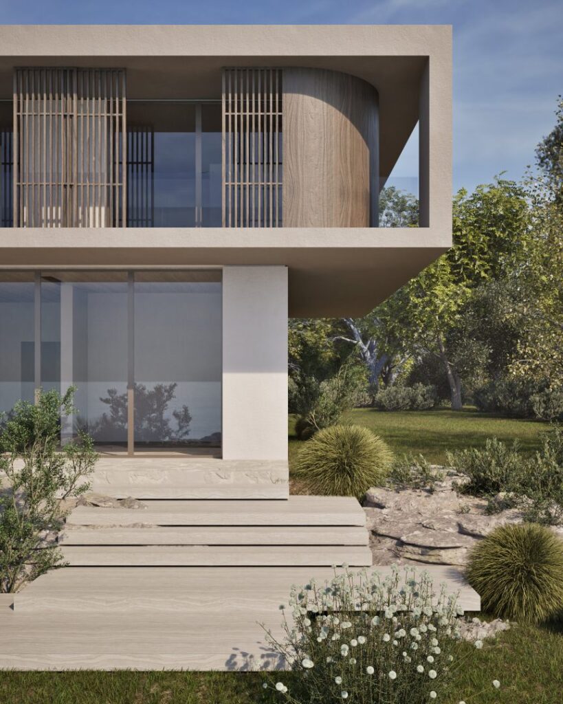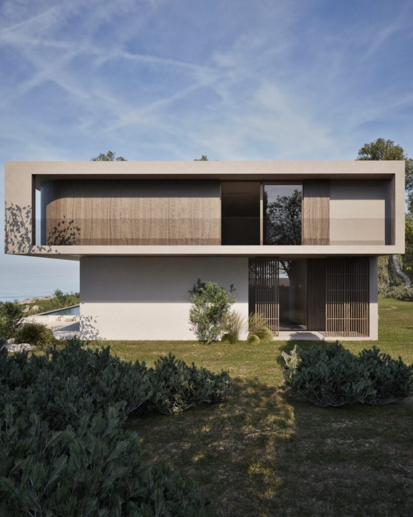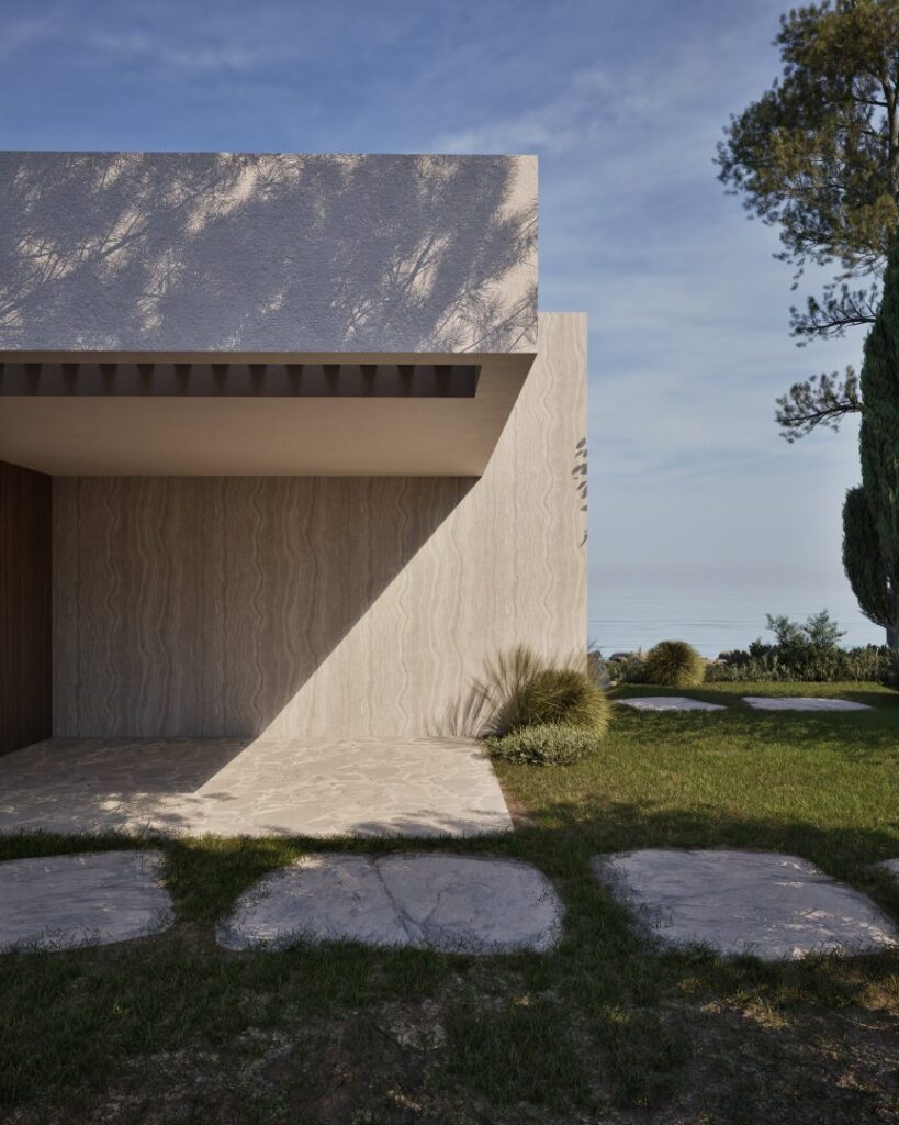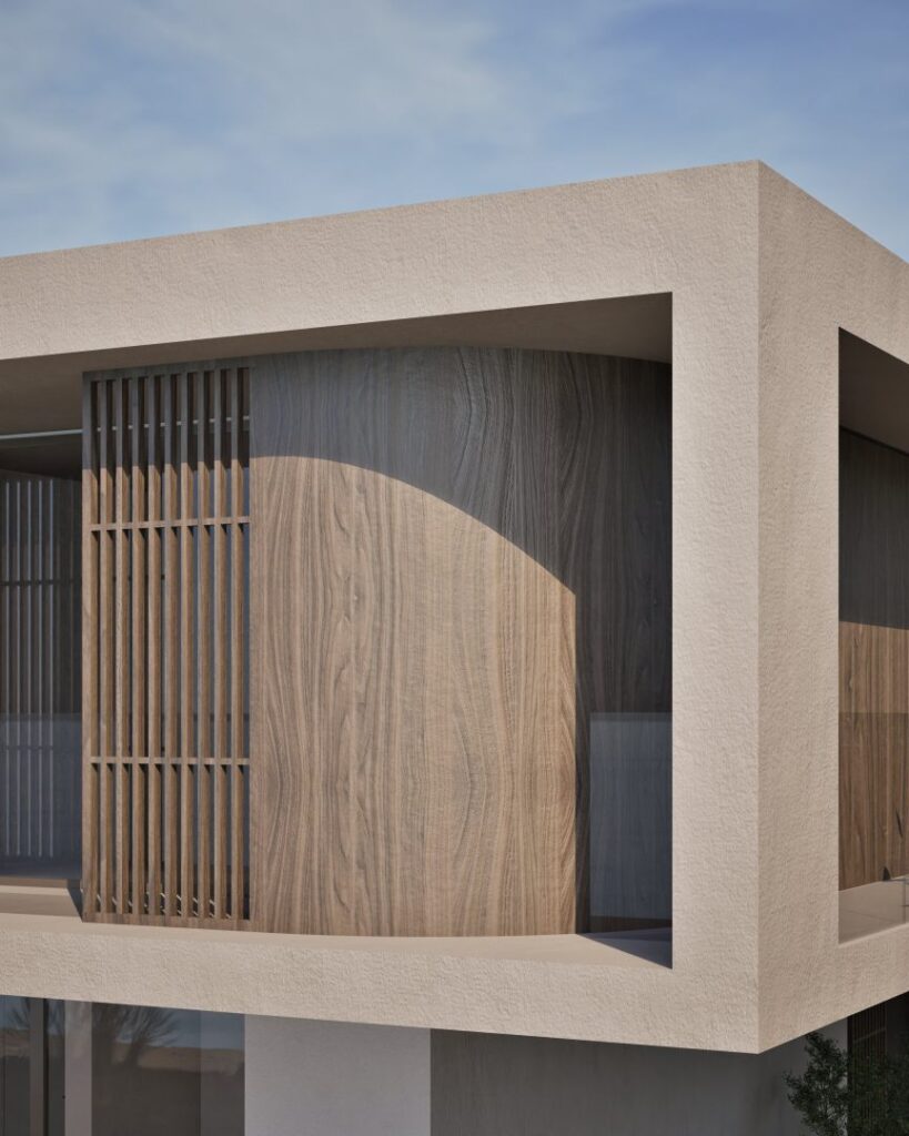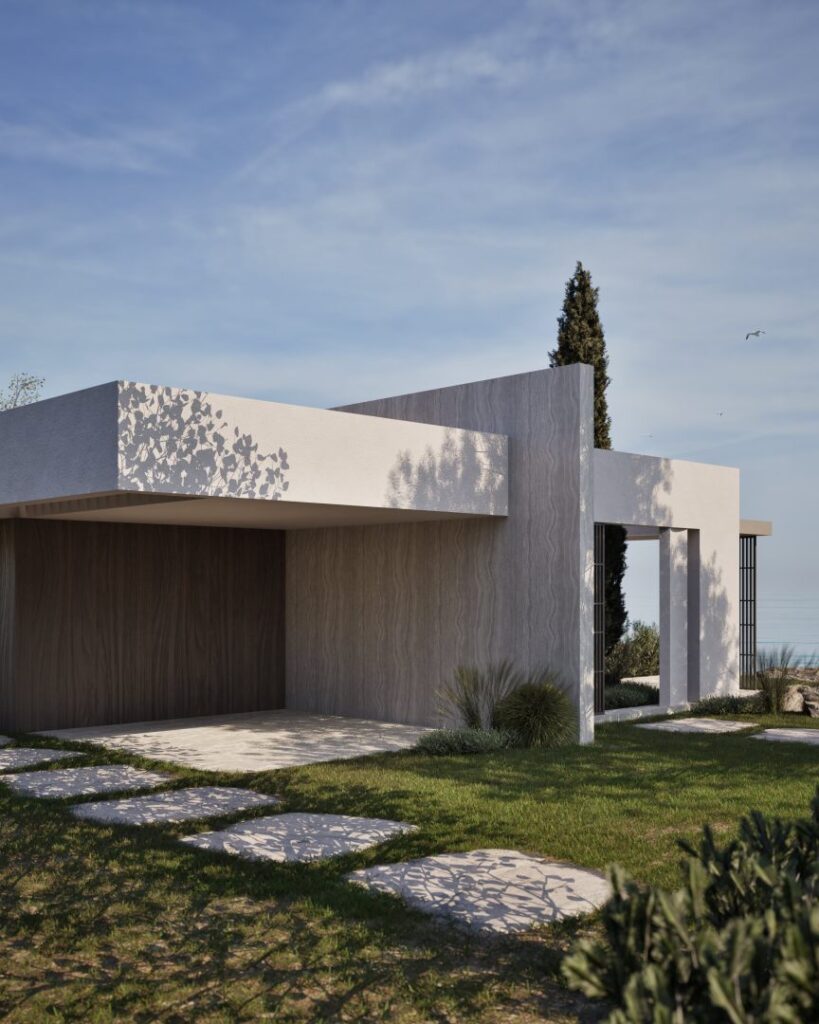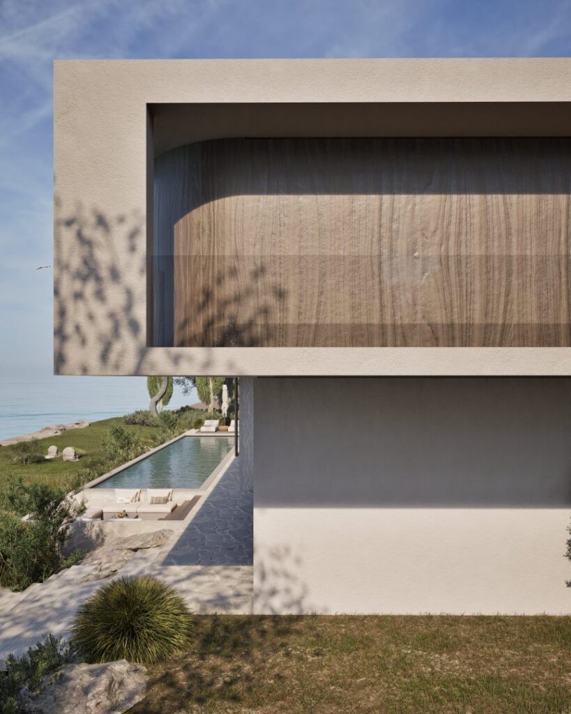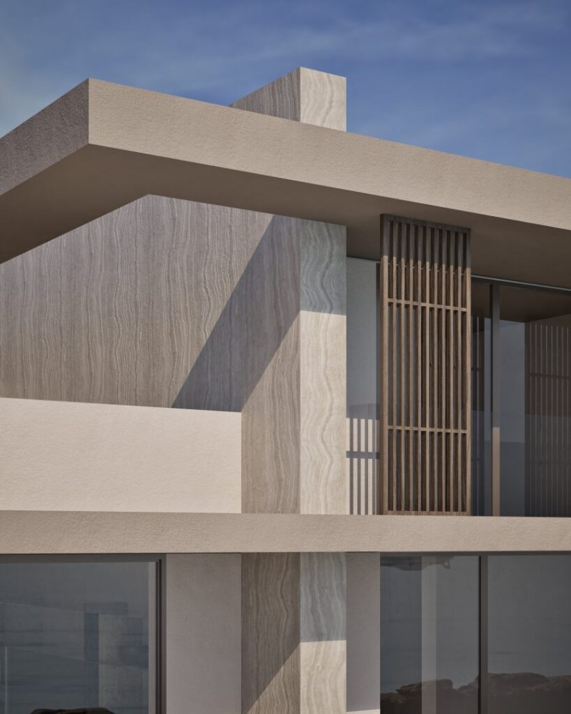 Villa Ciel rests along a lush coastal landscape, surrounded by trees and vibrant vegetation. With a strong, geometric design, the villa’s clean lines and clear shapes form a striking architectural statement. Decorative wooden and gypsum surfaces soften the structure, introducing a subtle warmth to the modern design. Shading panels add a natural rhythm and softness, creating a gentle play of light and shadow throughout the day. The travertine marble brings a timeless sophistication.