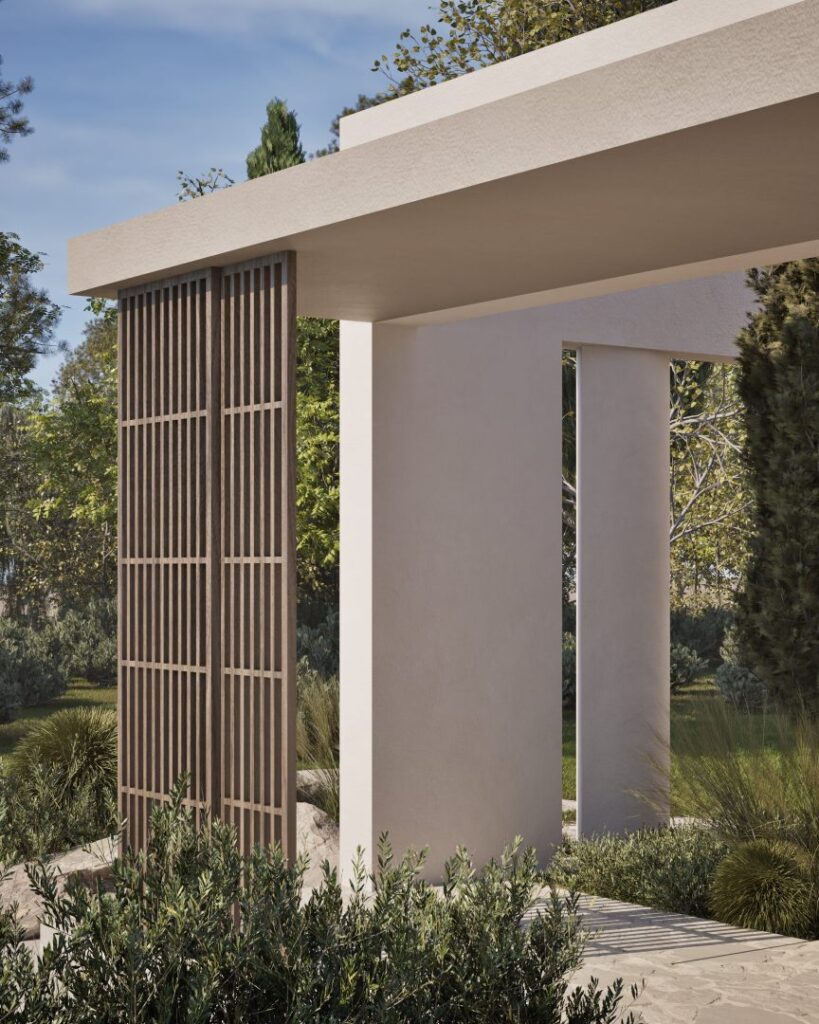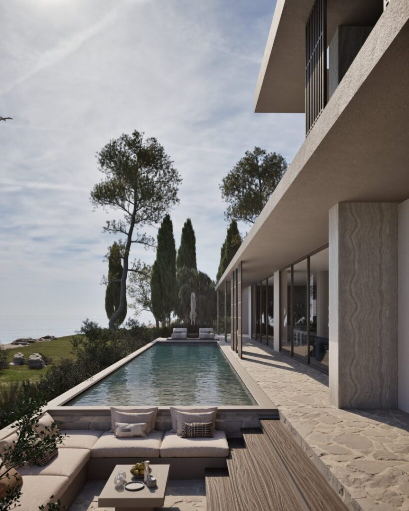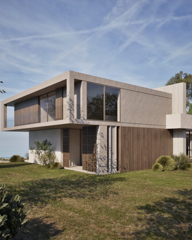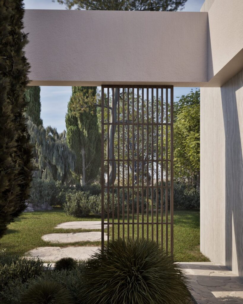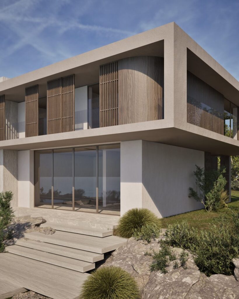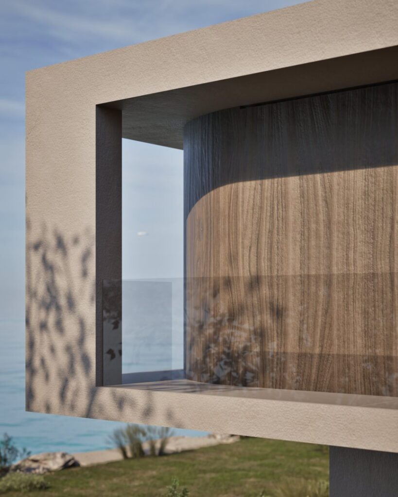 Villa Ciel rests along a lush coastal landscape, surrounded by trees and vibrant vegetation. With a strong, geometric design, the villa’s clean lines and clear shapes form a striking architectural statement. Decorative wooden and gypsum surfaces soften the structure, introducing a subtle warmth to the modern design. Shading panels add a natural rhythm and softness, creating a gentle play of light and shadow throughout the day. The travertine marble brings a timeless sophistication.