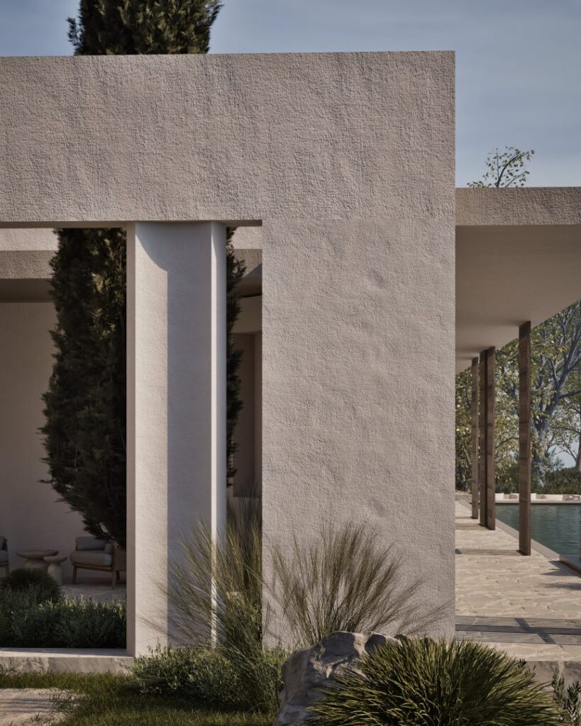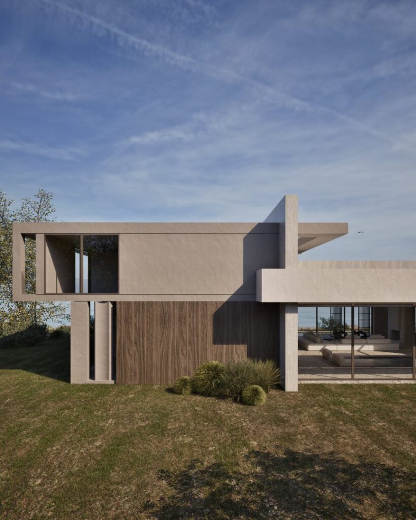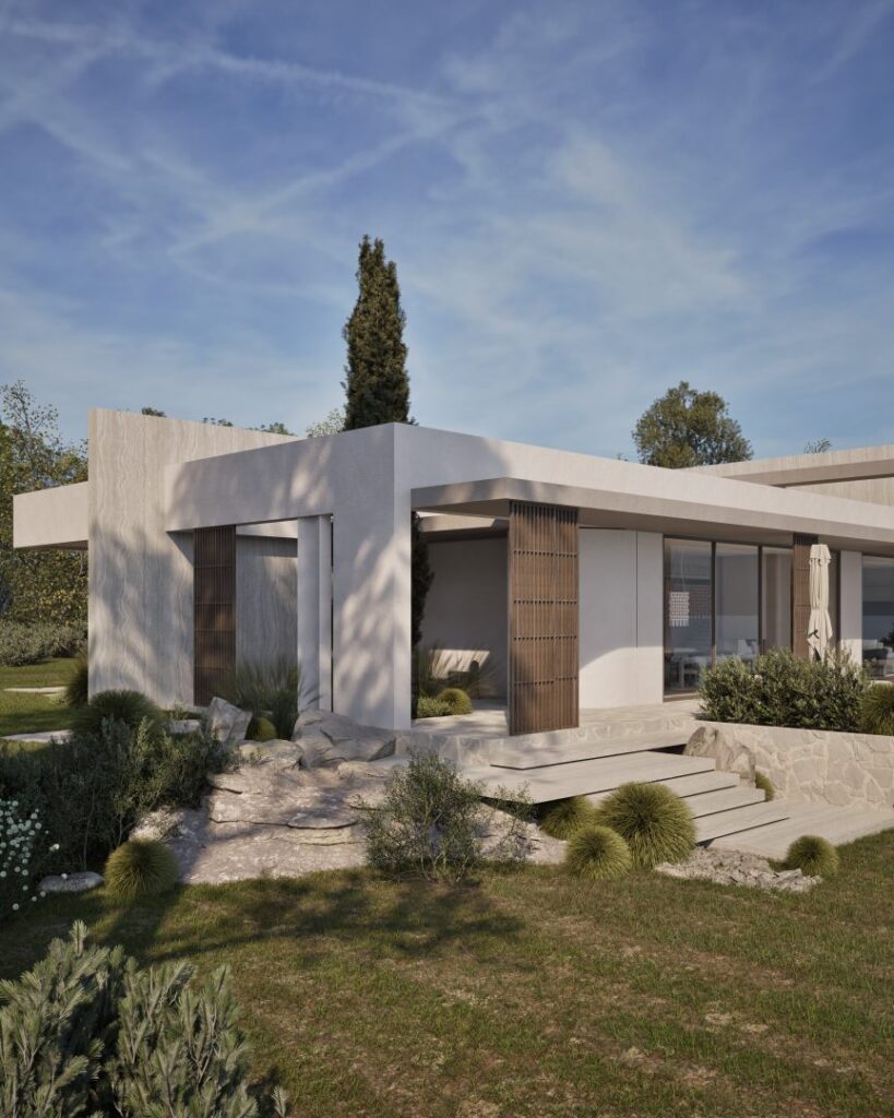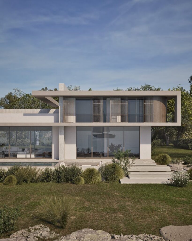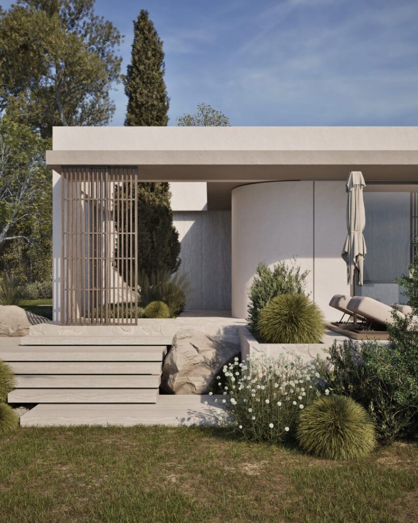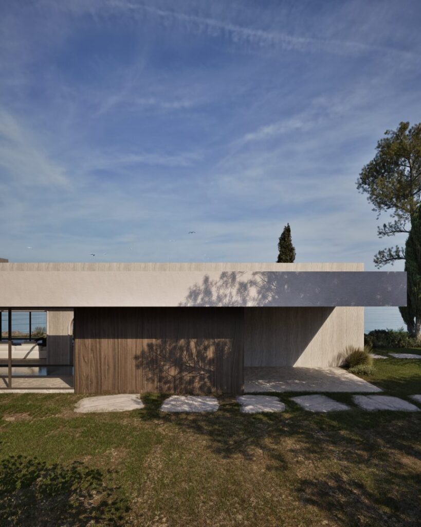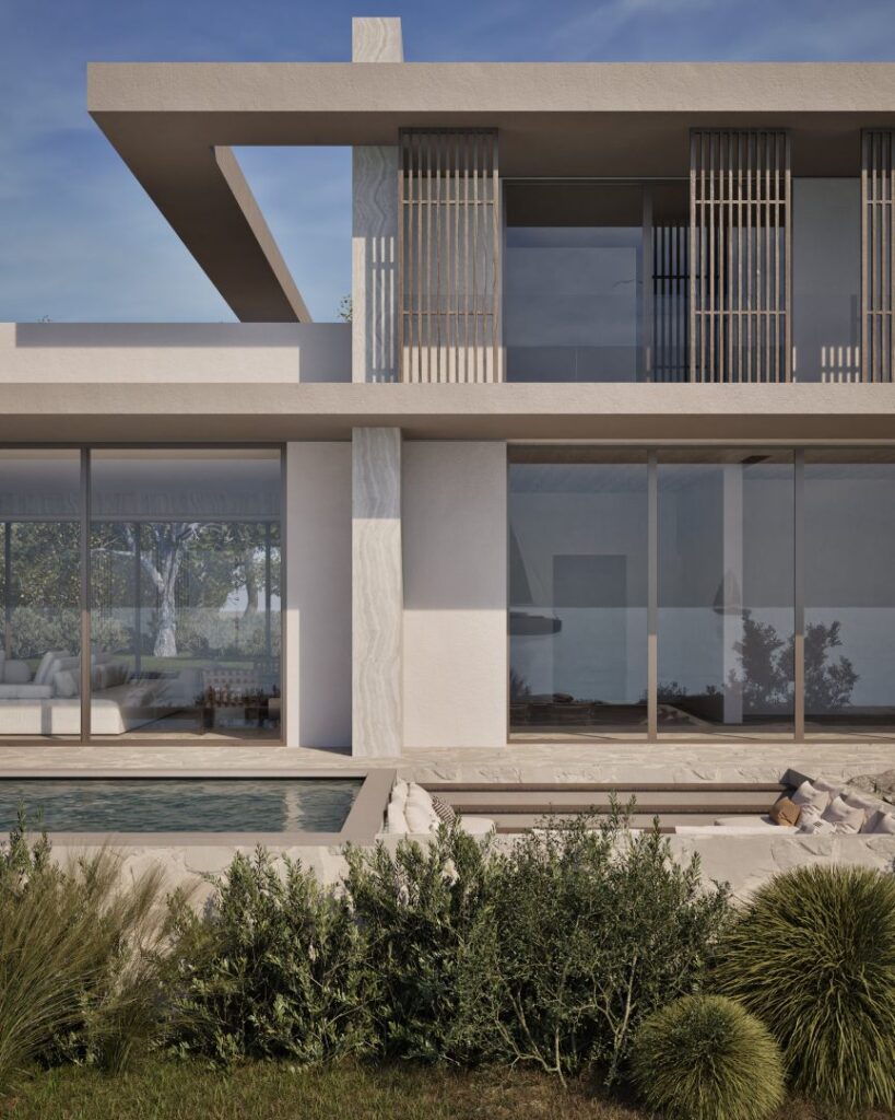 Villa Ciel rests along a lush coastal landscape, surrounded by trees and vibrant vegetation. With a strong, geometric design, the villa’s clean lines and clear shapes form a striking architectural statement. Decorative wooden and gypsum surfaces soften the structure, introducing a subtle warmth to the modern design. Shading panels add a natural rhythm and softness, creating a gentle play of light and shadow throughout the day. The travertine marble brings a timeless sophistication.
