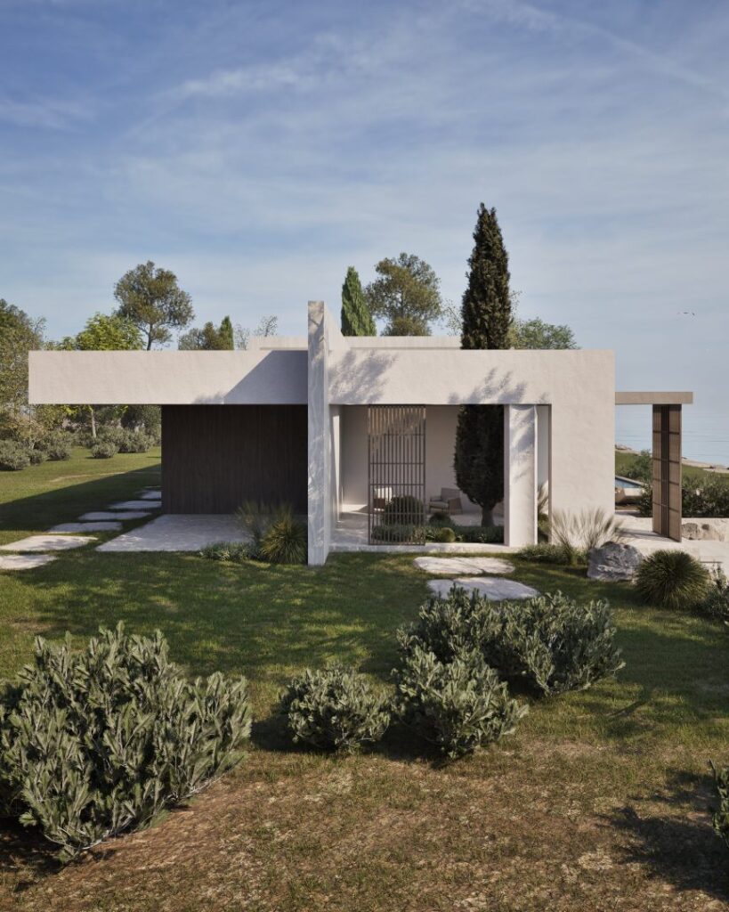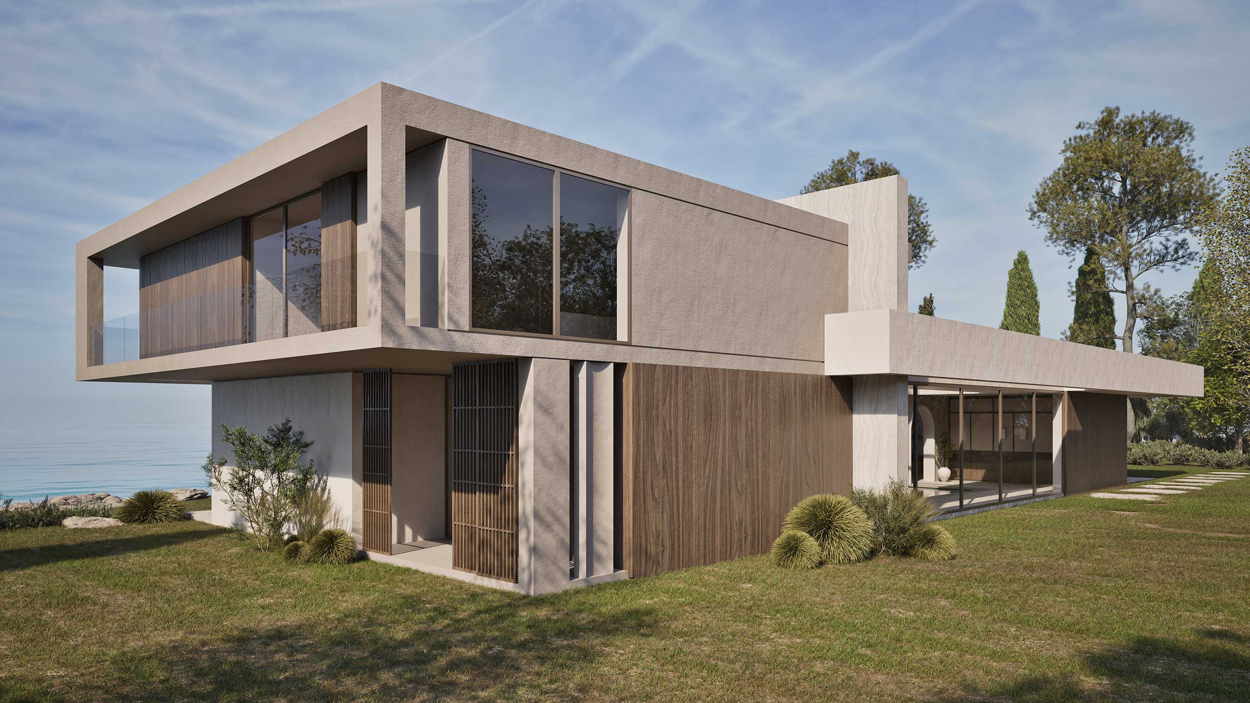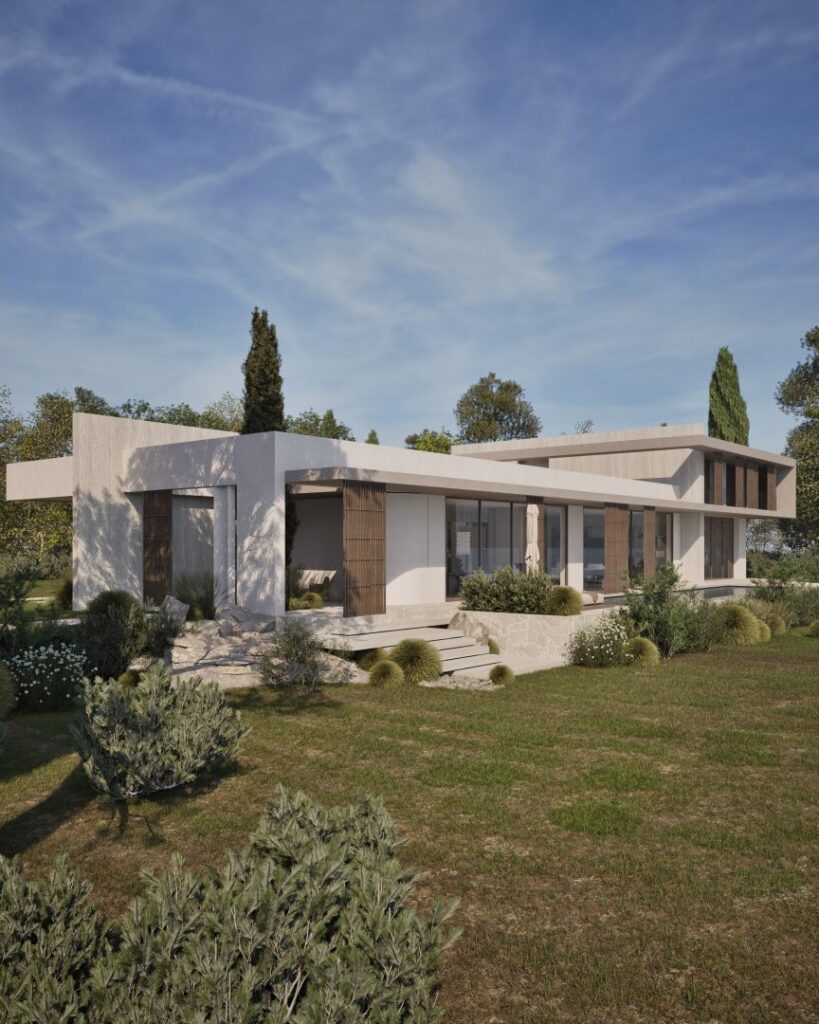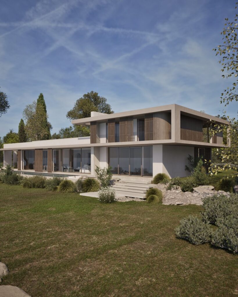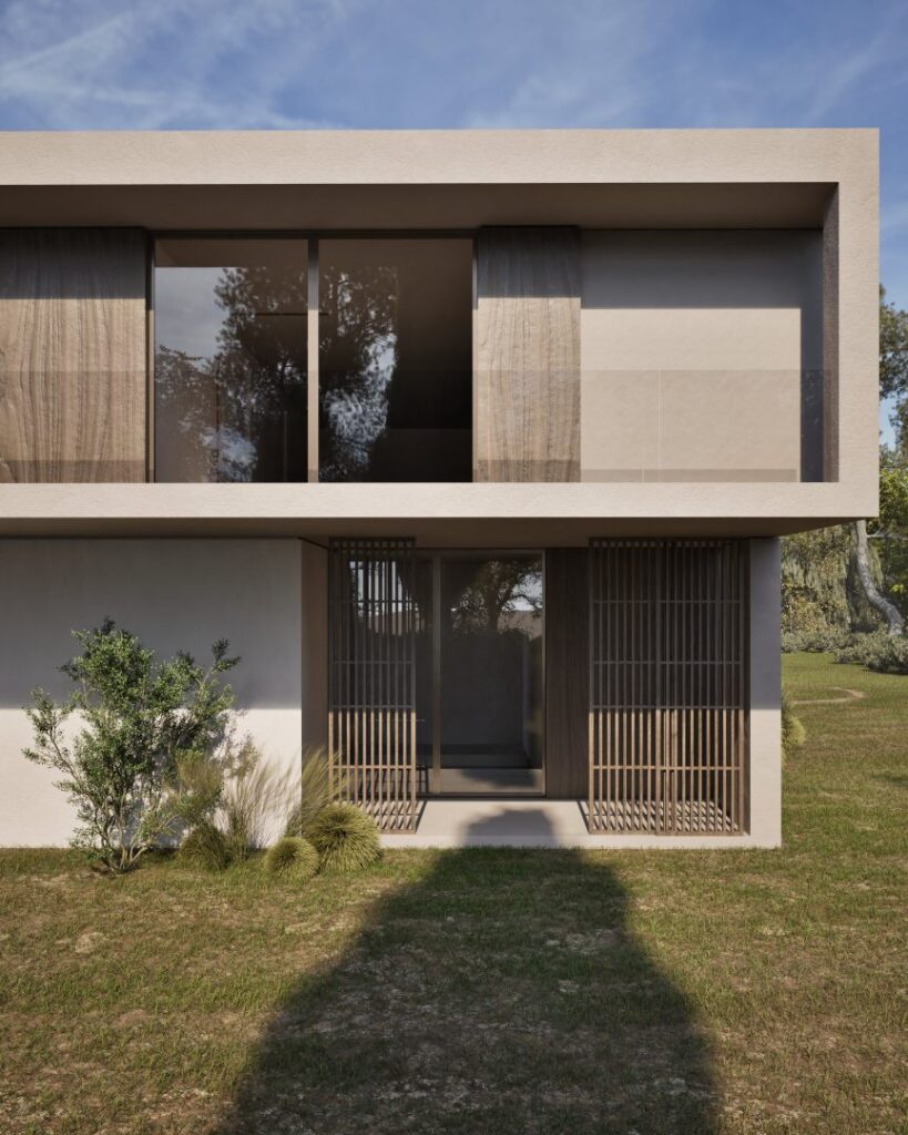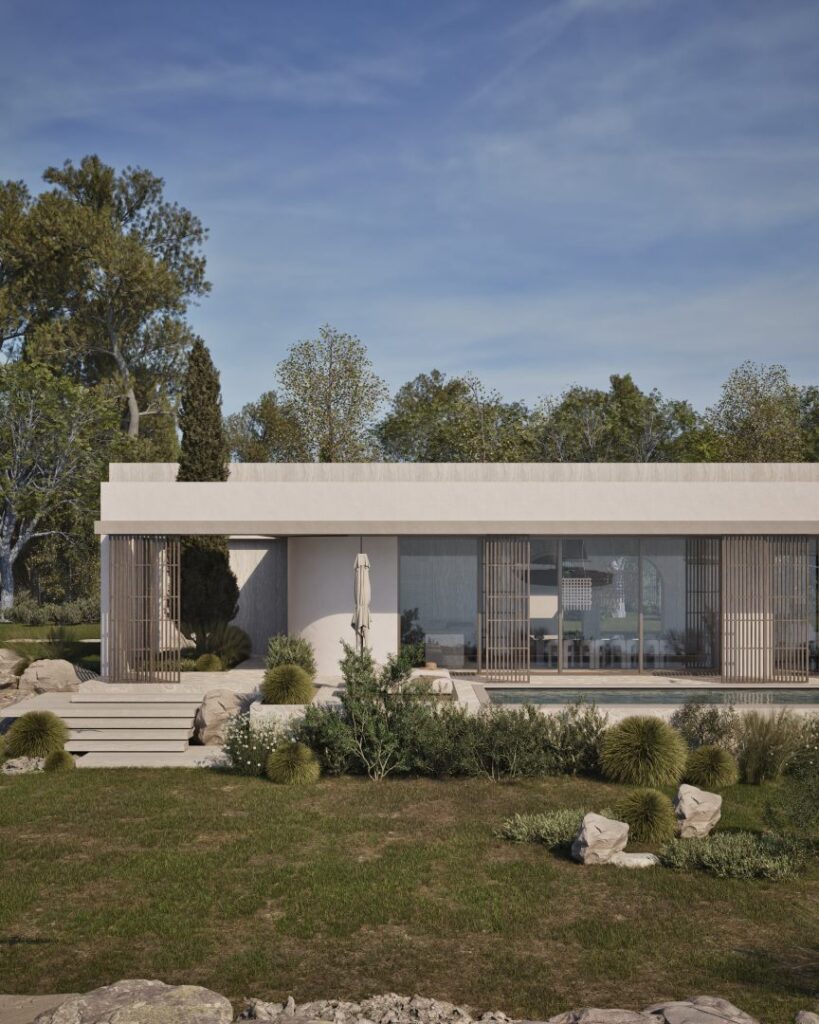 Villa Ciel rests along a lush coastal landscape, surrounded by trees and vibrant vegetation. With a strong, geometric design, the villa’s clean lines and clear shapes form a striking architectural statement. Decorative wooden and gypsum surfaces soften the structure, introducing a subtle warmth to the modern design. Shading panels add a natural rhythm and softness, creating a gentle play of light and shadow throughout the day. The travertine marble brings a timeless sophistication.