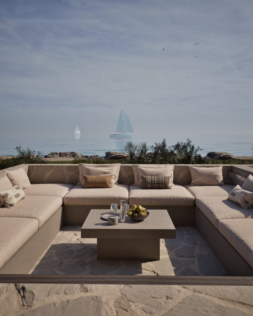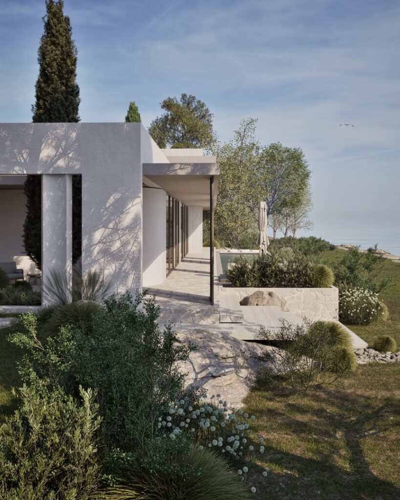 Spanning two levels, Villa Ciel is thoughtfully designed to separate communal areas from private quarters, ensuring both privacy and connectivity with nature. Expansive openings throughout offer sweeping views of the sea and lush landscape from every space. An internal and external pool complement each other, inviting relaxation and connection to the coastal surroundings. Inside, the soft, tranquil interior design echoes the gentle flow of the sea. The villa’s architectural purity and thoughtful integration of indoor and outdoor spaces offer a living experience where natural beauty and sophisticated design coexist gracefully.