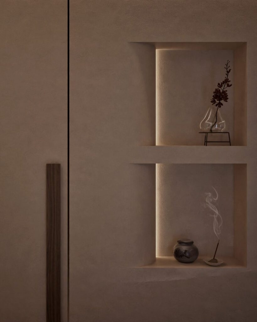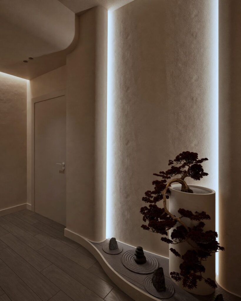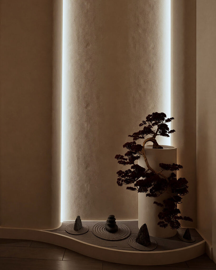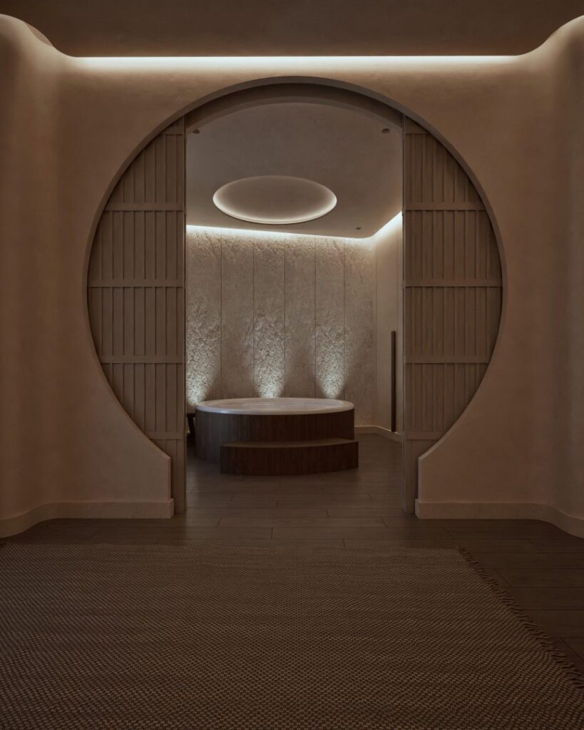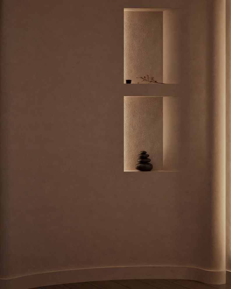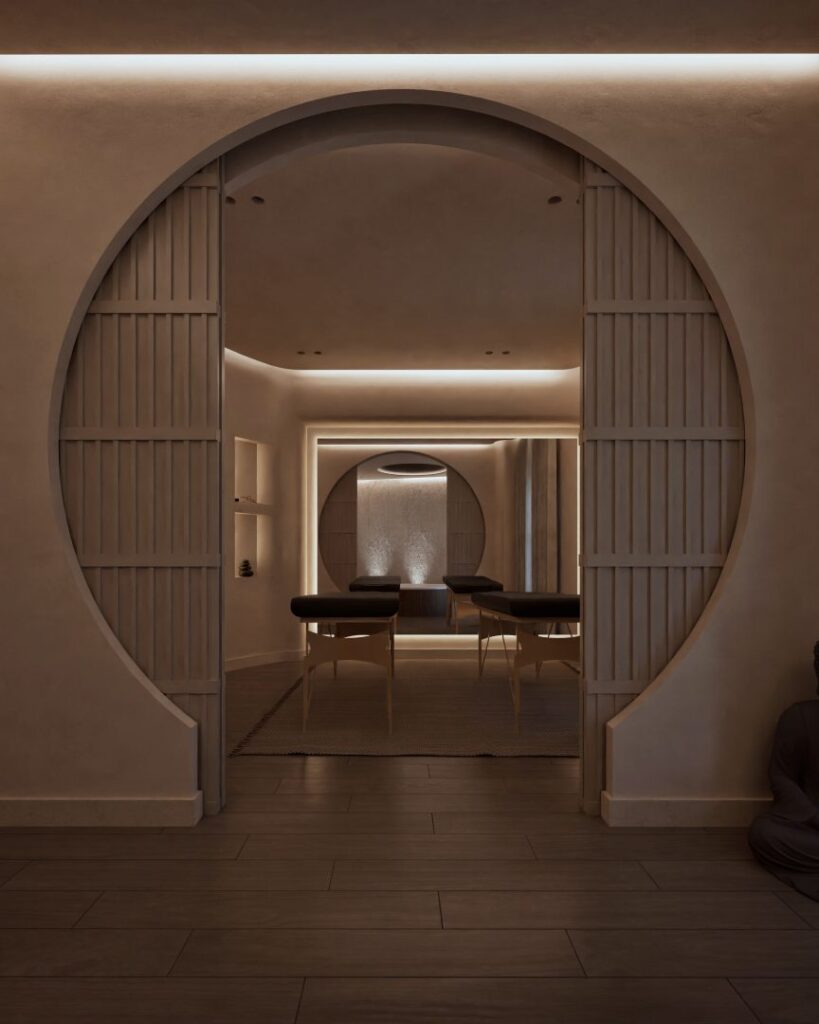 The recent renovation of a wellness area in the heart of Athens has transformed the space into a serene retreat, seamlessly blending modern design with traditional Japanese elements. The redesign focuses on creating a holistic experience that engages all the senses, offering a sanctuary of calm amidst the urban landscape. The interior is now characterized by its elegant curves. These fluid lines not only enhance the aesthetic appeal but also contribute to the overall sense of tranquility within the space. The walls are painted in beige tones of polished concrete, providing a soft, natural backdrop that is both soothing and timeless. This is complemented by the incorporation of wood, which introduces warmth and a tactile quality that invites touch and interaction.