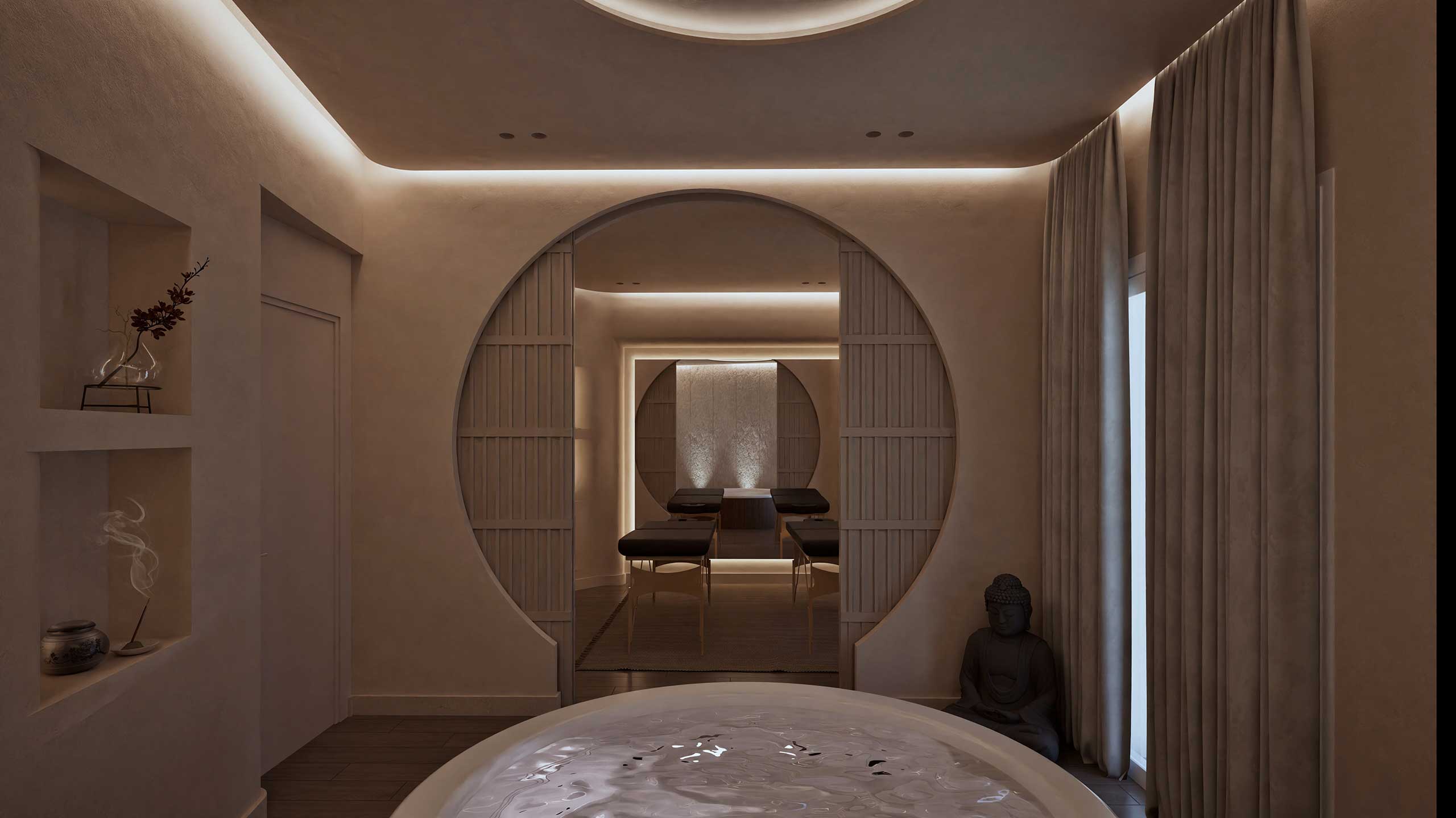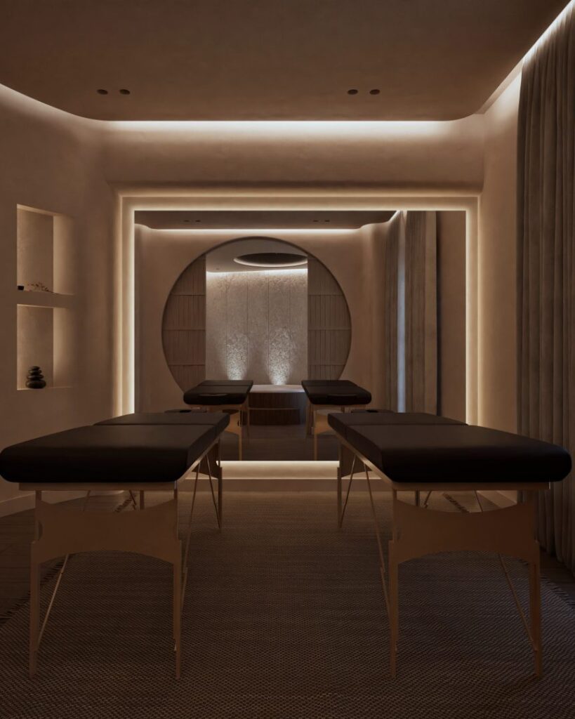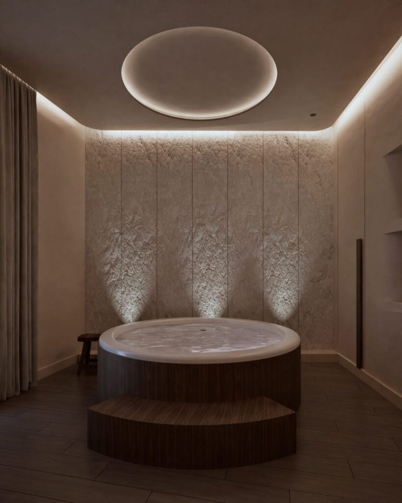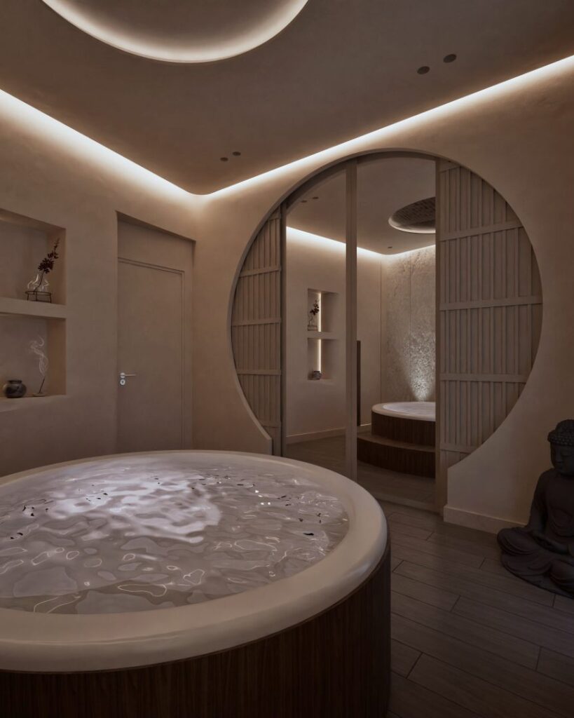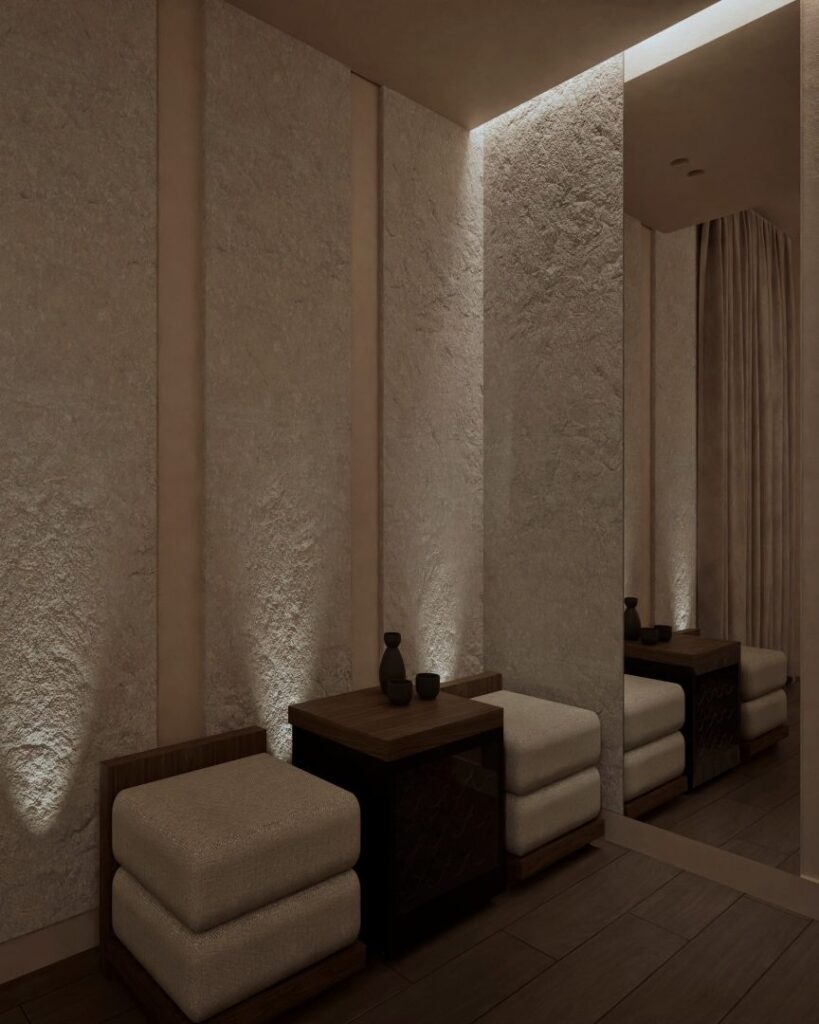 Upon entering the spa, guests are welcomed into a cozy seating area that exudes comfort and simplicity. This area opens up to a small zen garden, a nod to traditional Japanese design. This entryway sets the tone for the entire spa experience, offering an immediate escape from the hustle and bustle of the city. The main massage area features a luxurious jacuzzi and two massage beds. The ambiance is enhanced by concealed atmospheric lighting, which casts a gentle, soothing glow throughout the space. Subtle fragrances permeate the air, chosen to promote relaxation and well-being, while soft, ambient sounds further enrich the sensory experience.